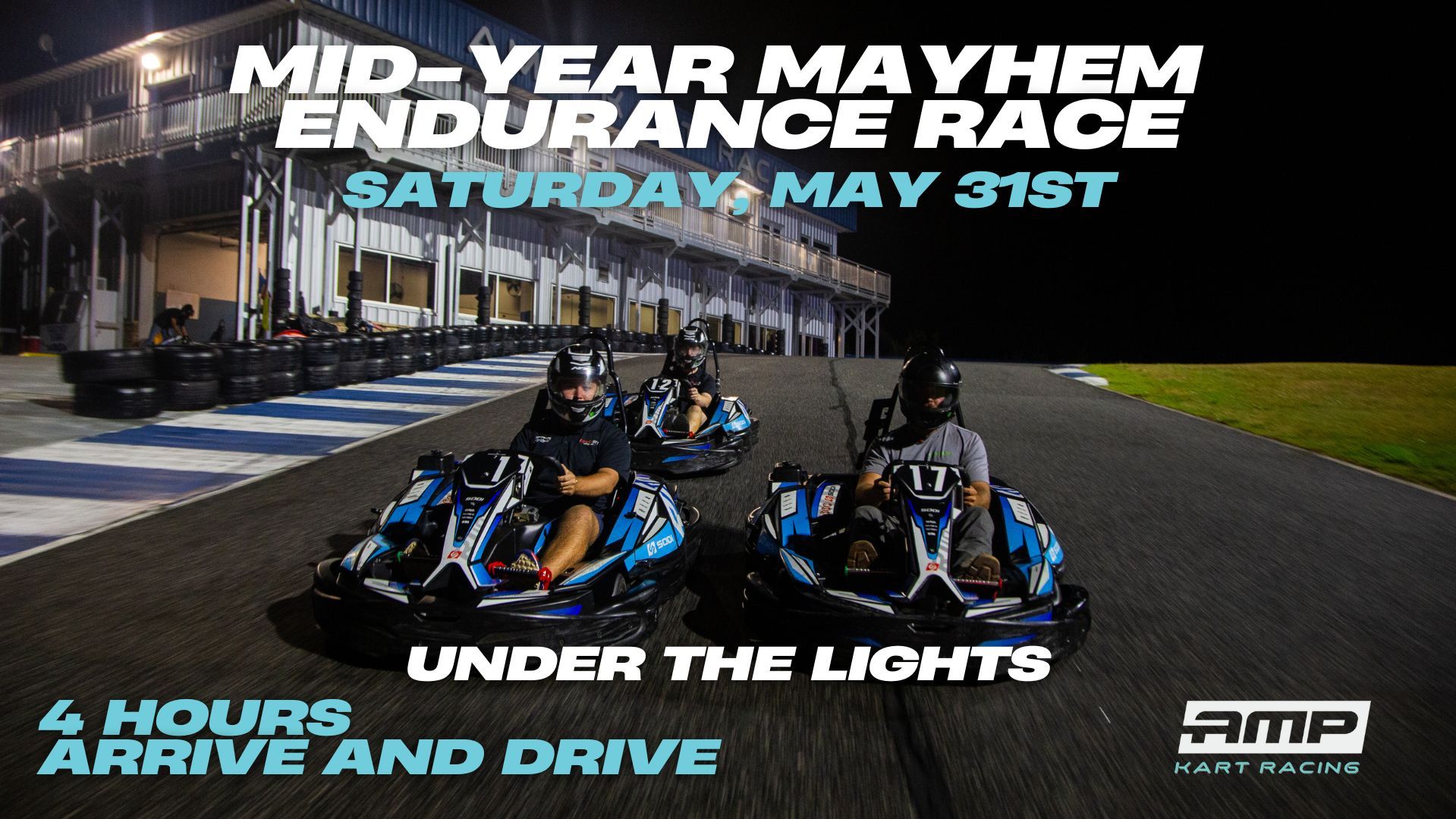 Welcome to AMP's 4 hour Endurance race. Each team is allowed 2-4 drivers. Teams will be using our concession karts for this event. This is an Arrive and Drive event, only close toed shoes required.